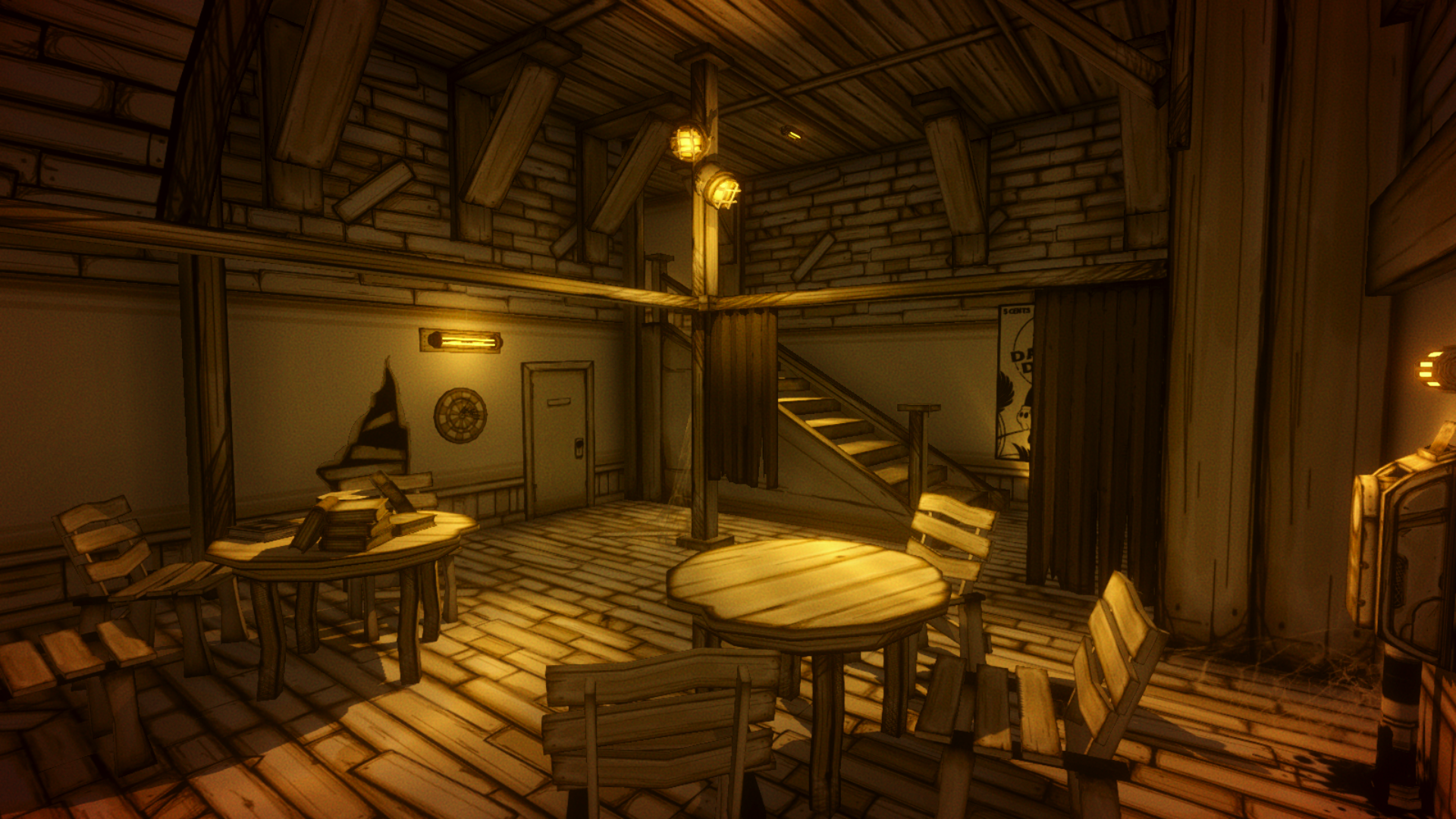 Внутри можно найти три стола, на одном из которых находятся плёнки. Слева находится дверь, за которой можно найти банки супа. Справа стоит стойка для перфокарты. В этой комнате можно сыграть в мини-игру — дартс. Если пройти дальше, то можно обнаружить заваленный досками проход. Выход из комнаты находится на лестнице.