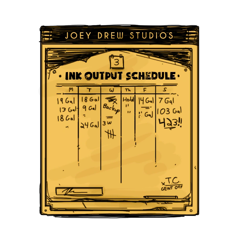 Работая на студию Джоуи Дрю, Томас столкнулся с большим количеством проблем. Во-первых, он утверждал о бесконечных потоках чернил, нагружающих здание студии Джоуи Дрю, примечая, что трубы под таким сильном давлением, что даже шумят. Он также считает, что от Чернильной машины и всего, что с ней связано, веет чем-то ненормальным. Он утверждает, что студия будет проклята, и о том, что он держит пари, что больше не будет выполнять ремонтные работы в студии Джоуи Дрю.[5]